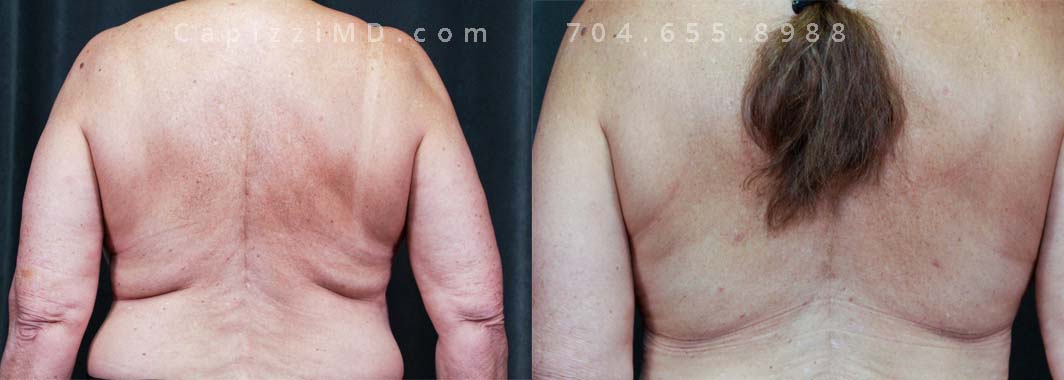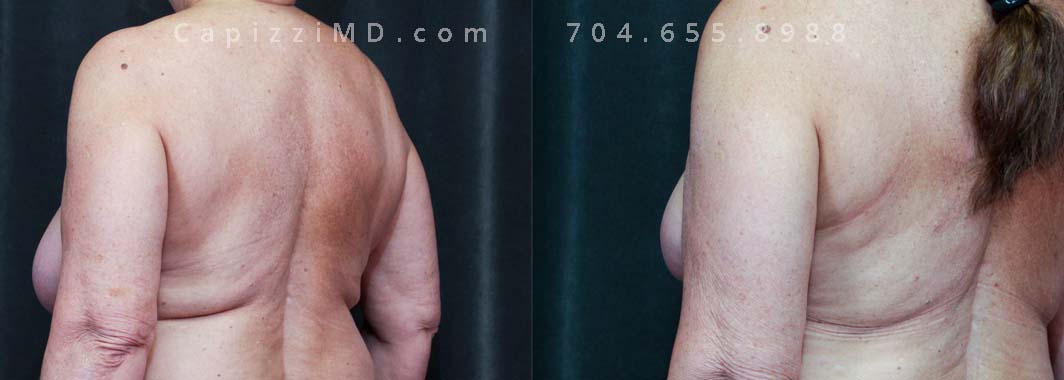 This patient was experiencing grooving from her bra straps and back pain from heavy breasts. She wanted breasts that were smaller and more proportional to her frame. Liposuction to her bra roll ensured that she had a nice contour around her back.