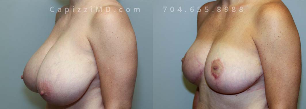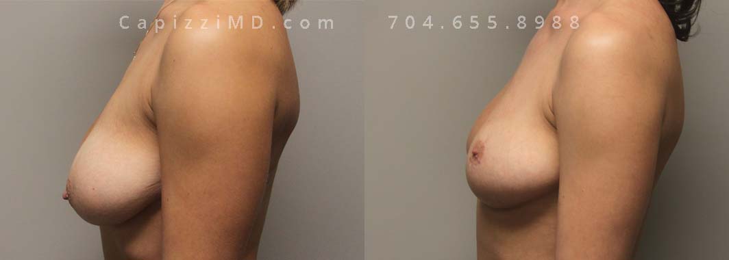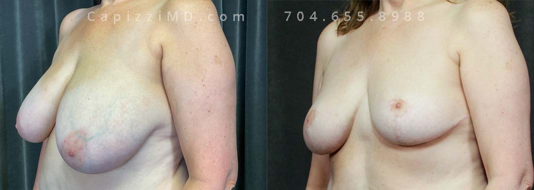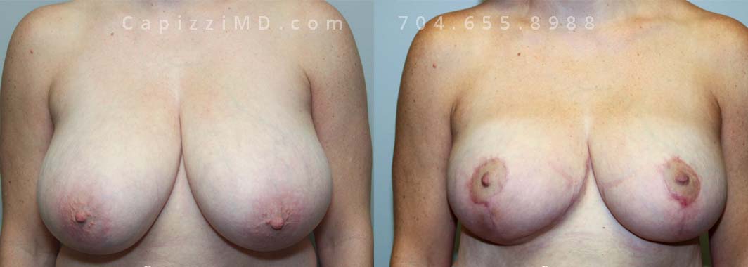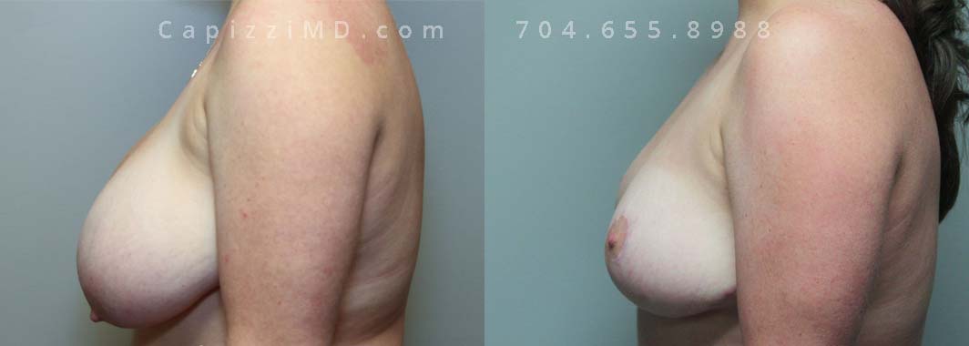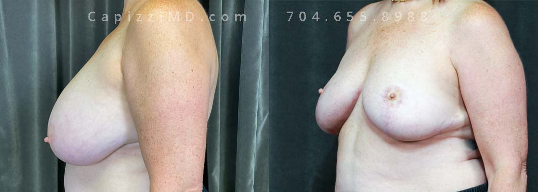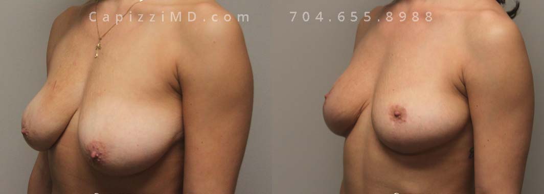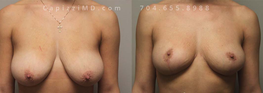 The patient had children and noticed that her breasts stayed large after she discontinued nursing. A breast reduction reduced the size of her breasts, removed excess skin, and realigned her nipples.