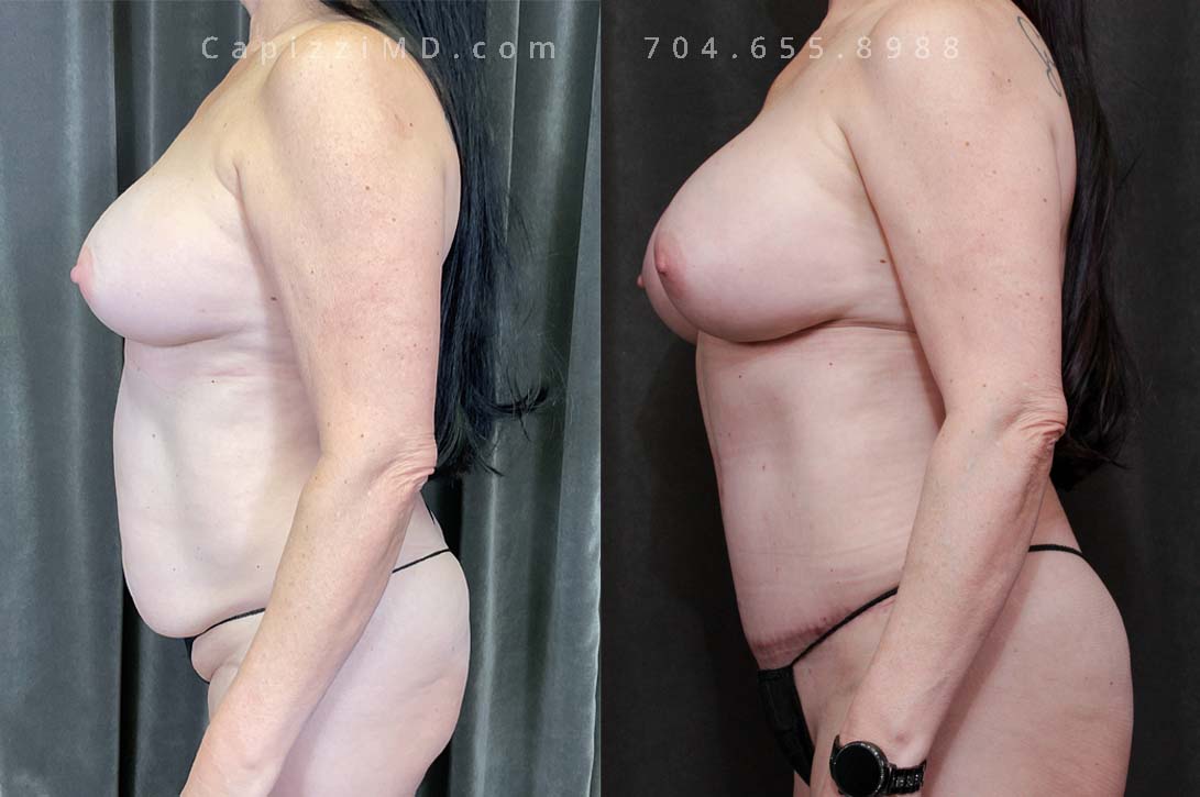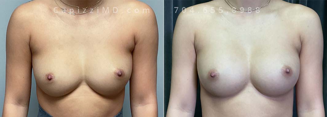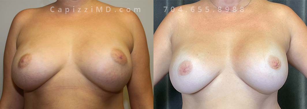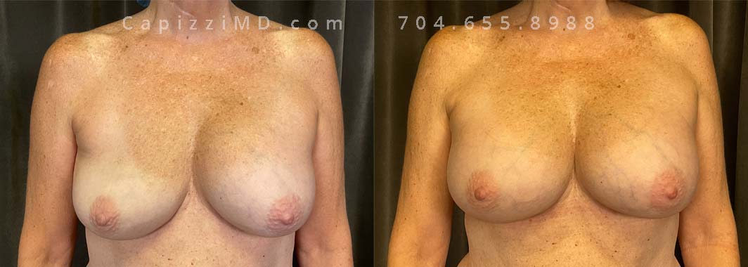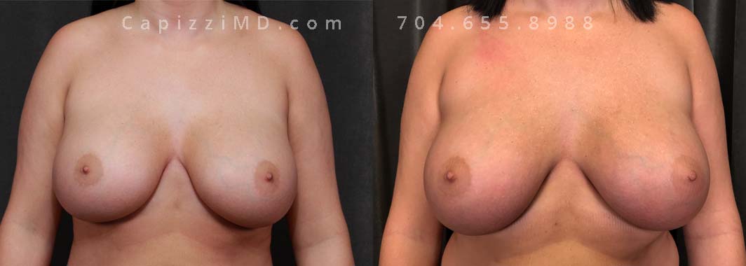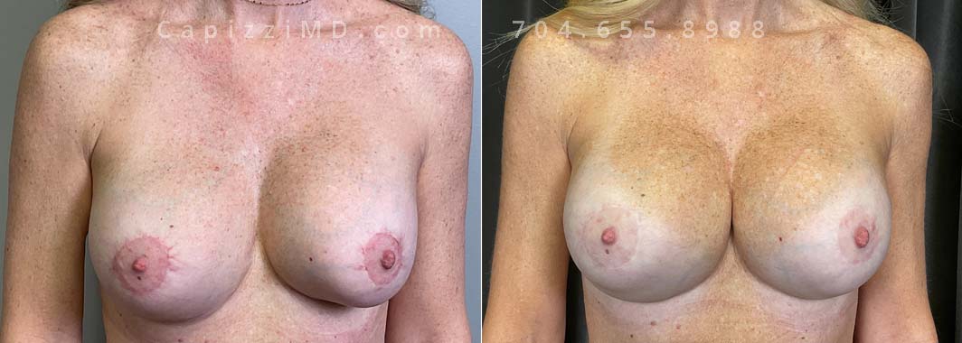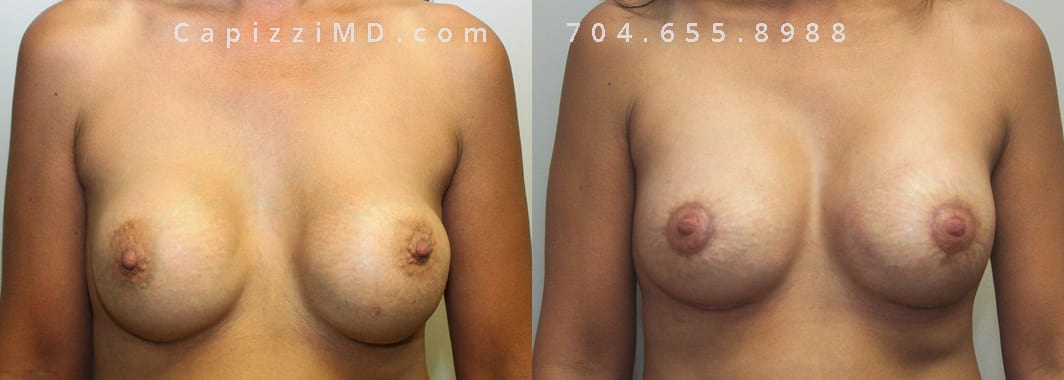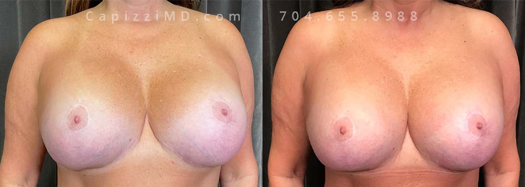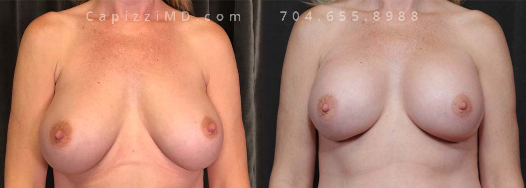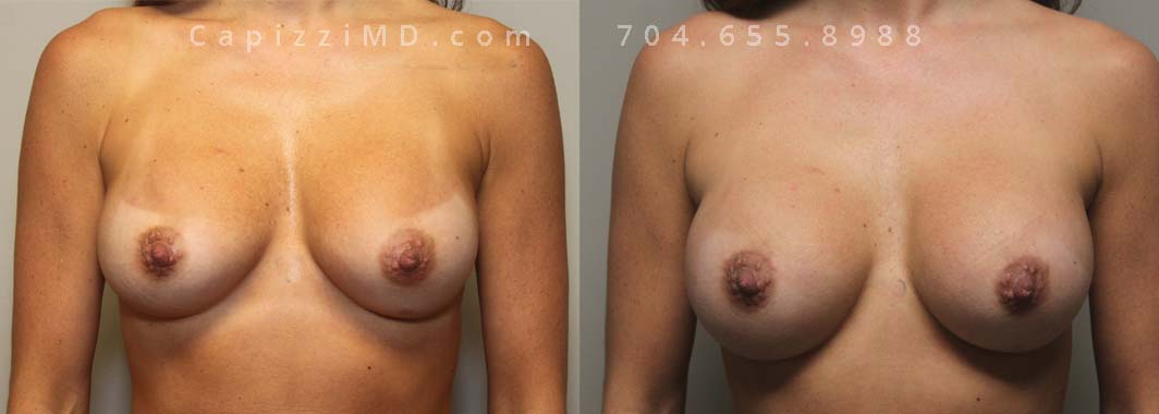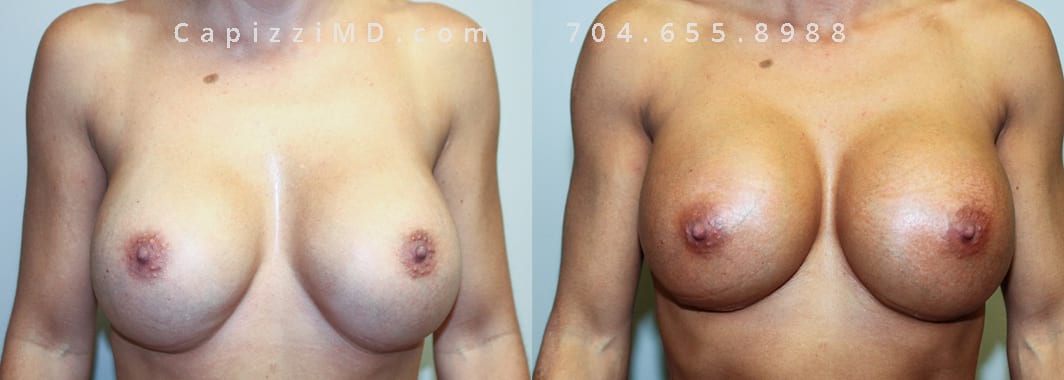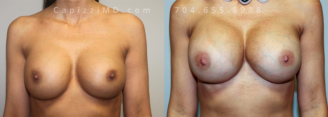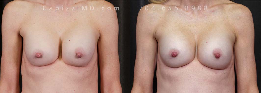 This patient wanted a bigger size and improved symmetry. She had Allergan Smooth Round Style 20 280cc implants and opted to have them replaced with Sientra Smooth Round High Profile 415cc with capsuloraphies to improve the appearance of her breasts.