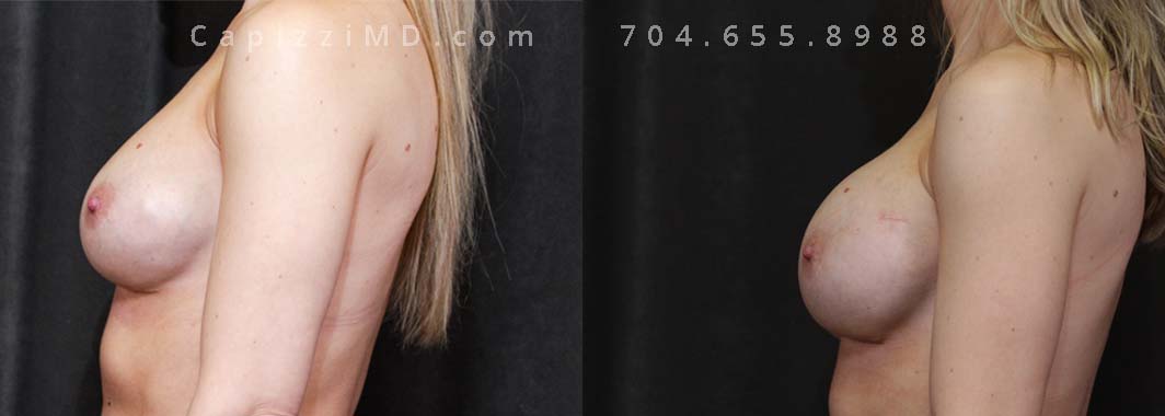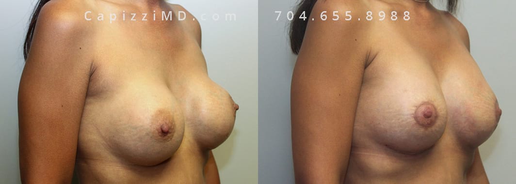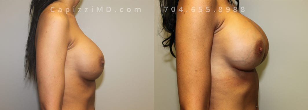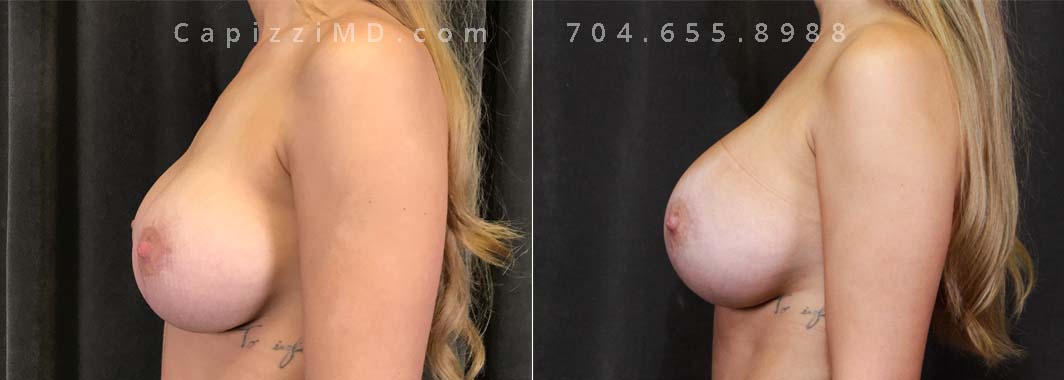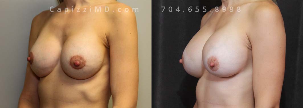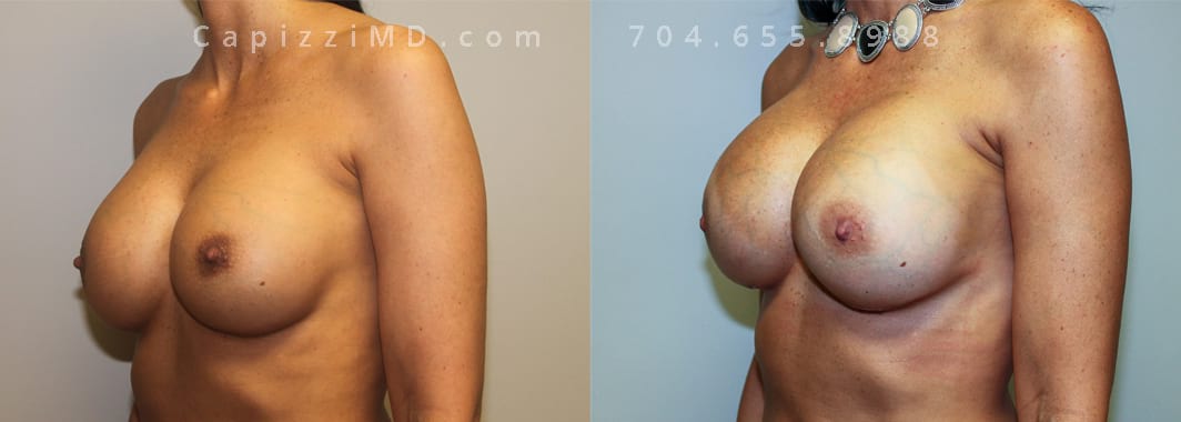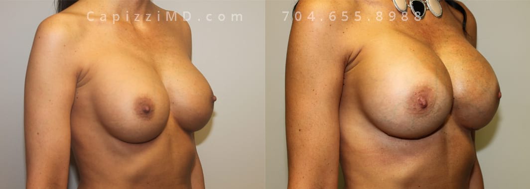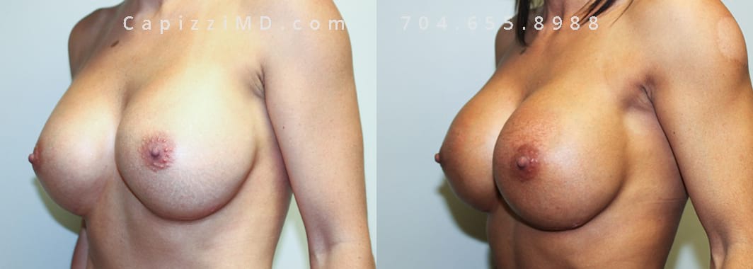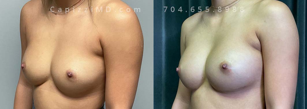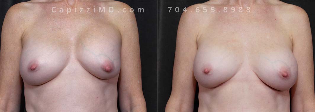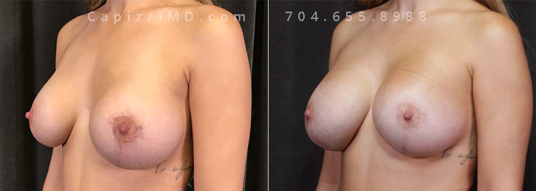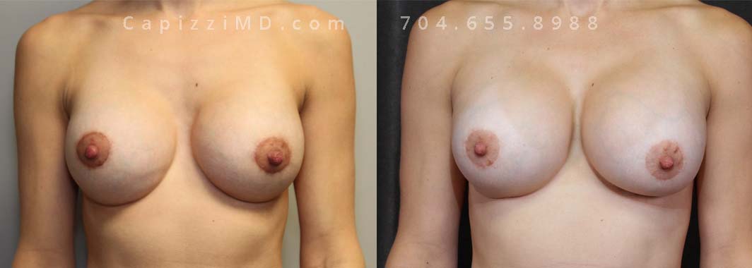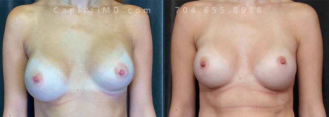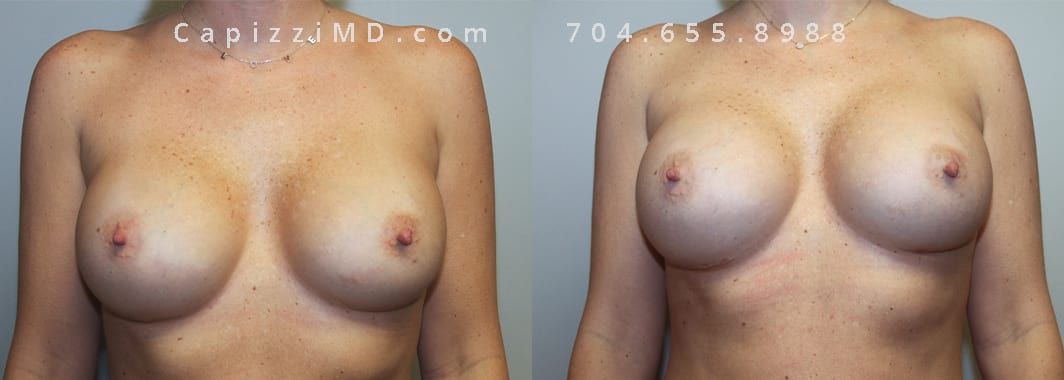 This patient desired a larger breast size and had an implant exchange, going from a Sientra Smooth Round High Profile 350cc implant to a Sientra Textured Round High Profile 590cc implant. She had capsule work done as well to improve symmetry.