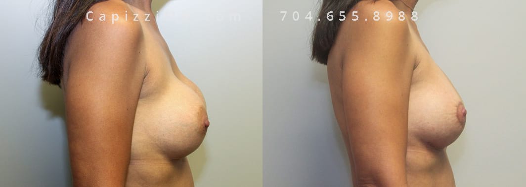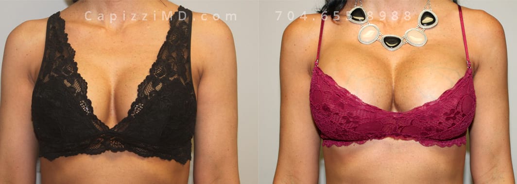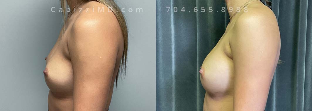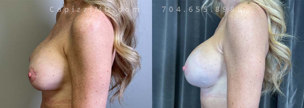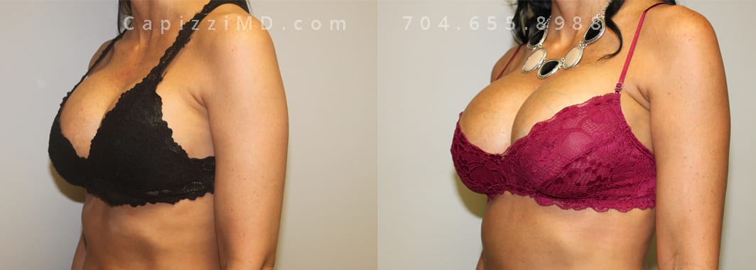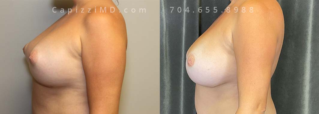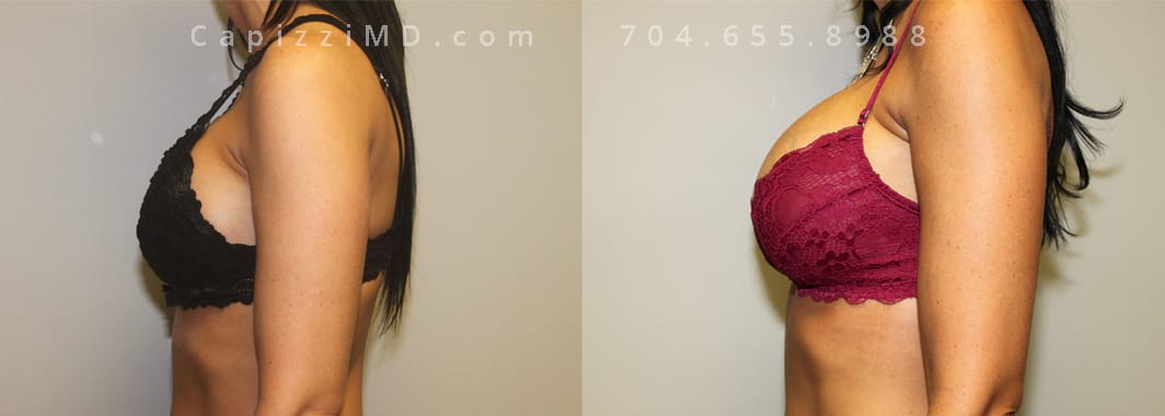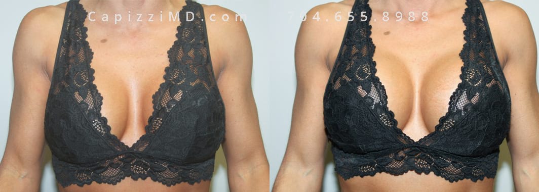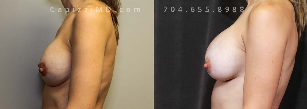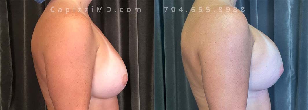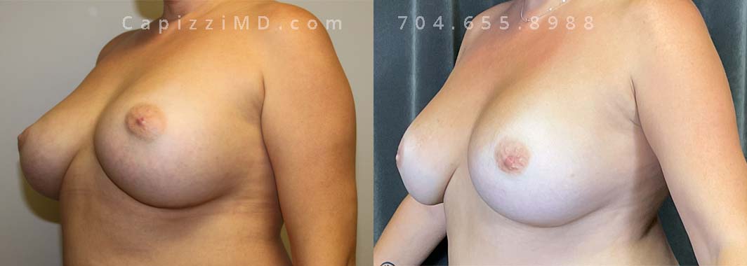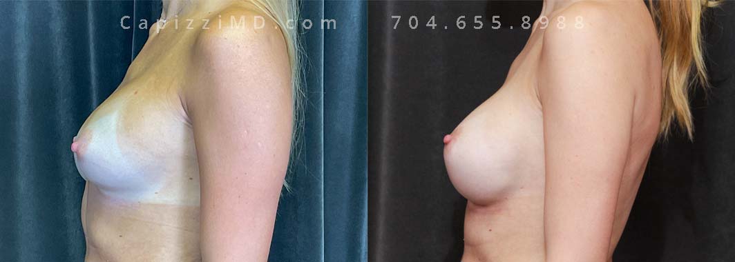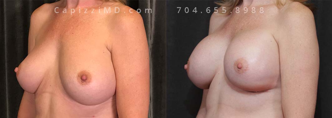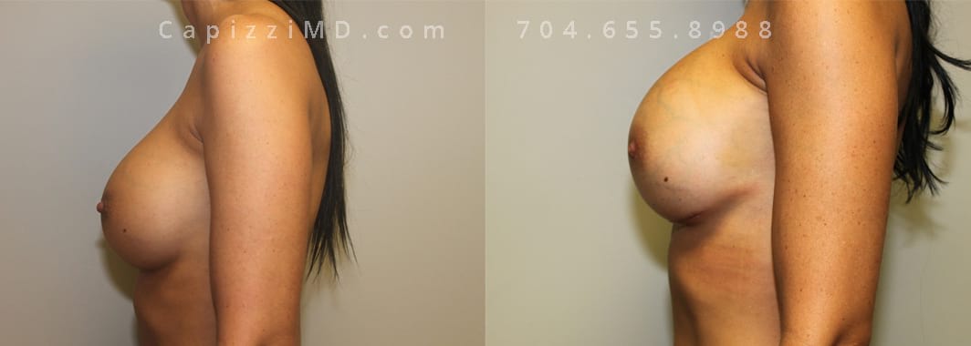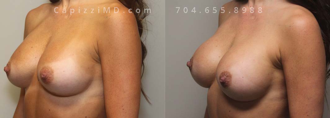 This patient desired a larger breast size and had an implant exchange, going from a Sientra Smooth Round High Profile 350cc implant to a Sientra Textured Round High Profile 590cc implant. She had capsule work done as well to improve symmetry.
