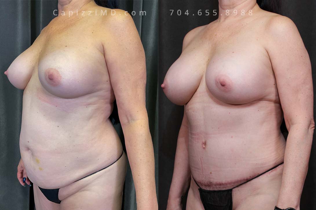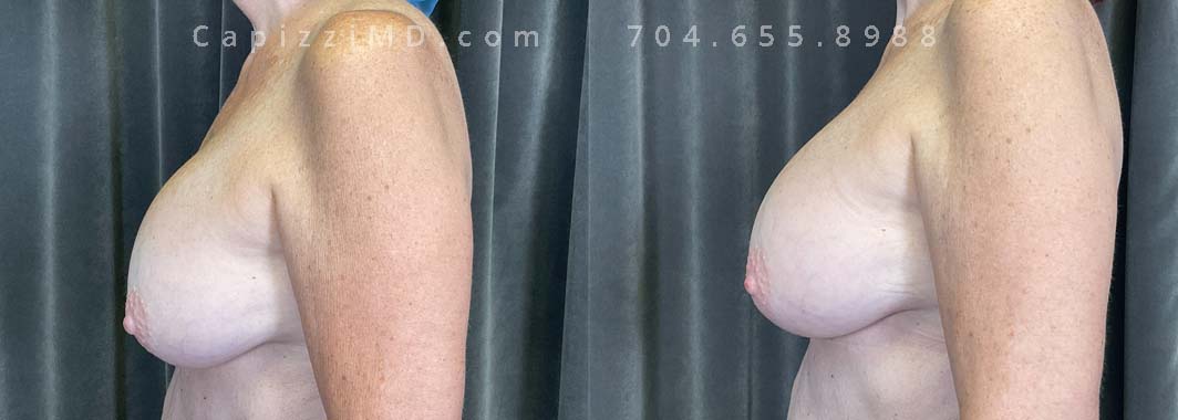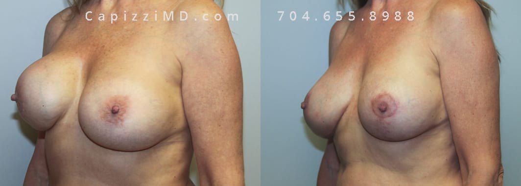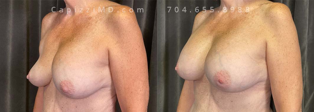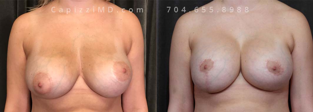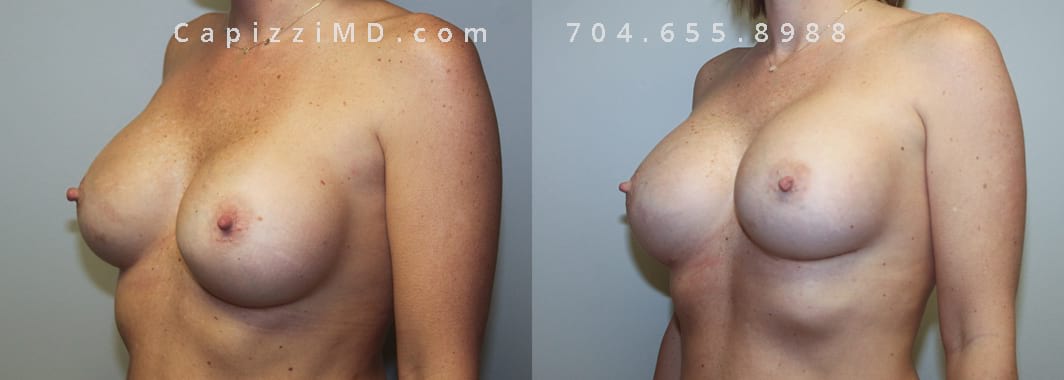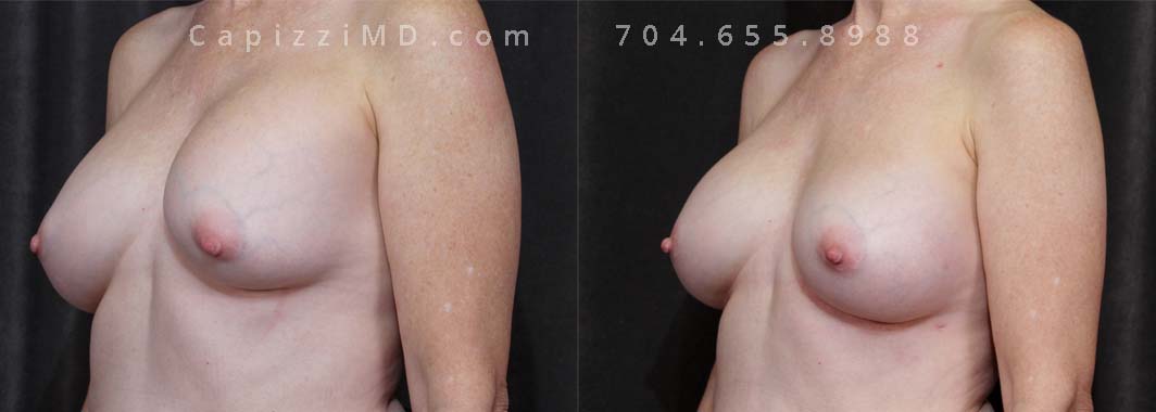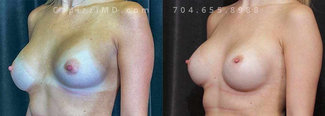 This patient was experiencing asymmetry and her left breast was “bottoming out.” Her Allergan Smooth Round Saline 320cc implants were removed and replaced with Sientra Textured Round High Profile 565cc implants to achieve better upper pole fullness and a larger appearance.