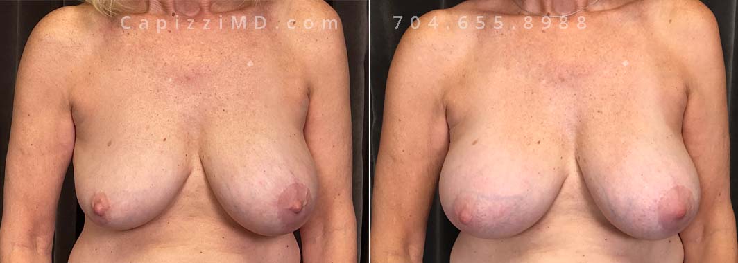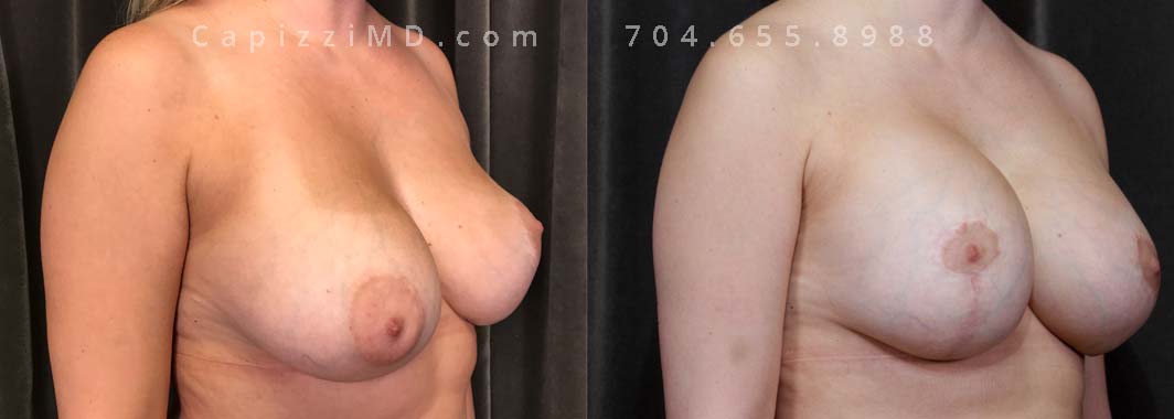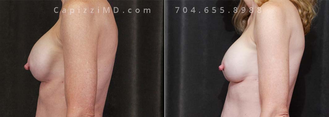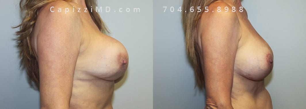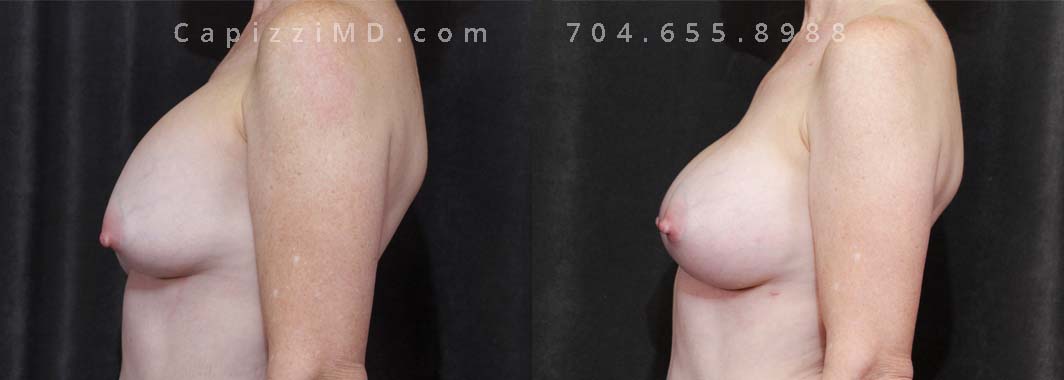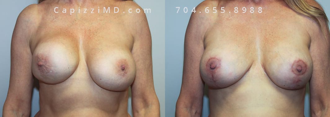 This patient experienced a right side rupture of her silicone implant. Her implants were exchanged for Sientra Smooth Round High Profile 285cc implants along with a modified breast lift for improved symmetry and appearance.
