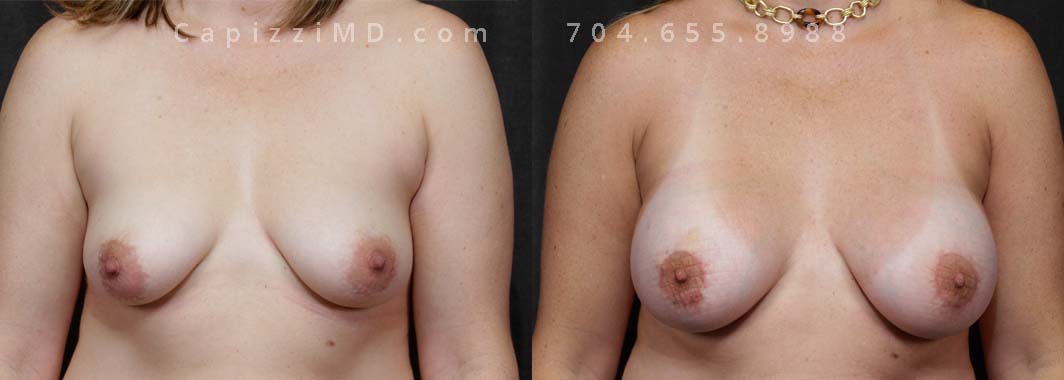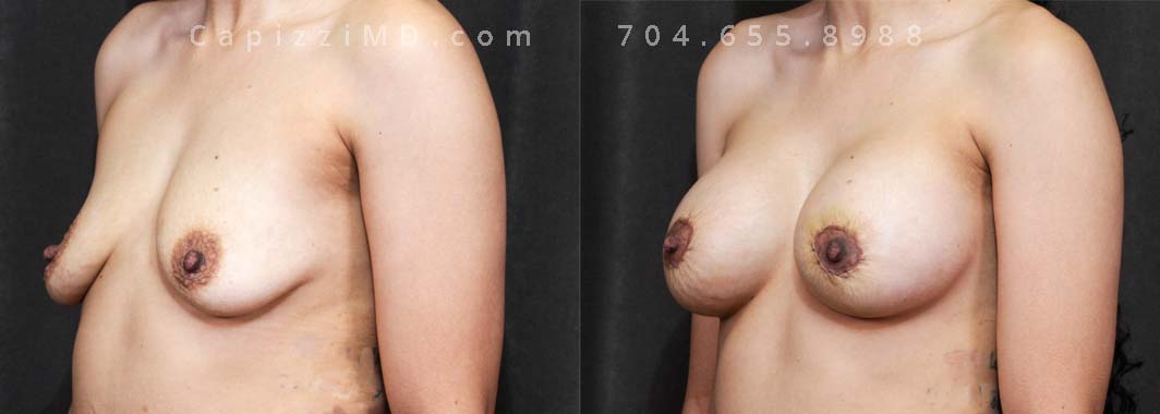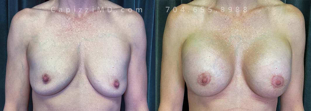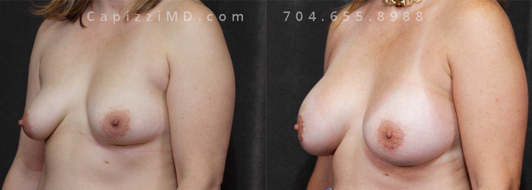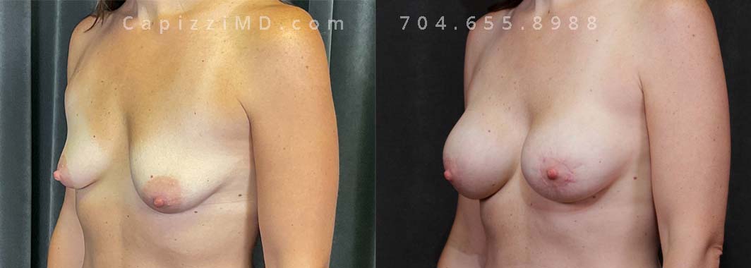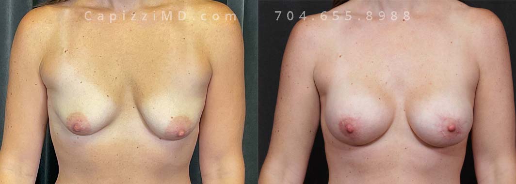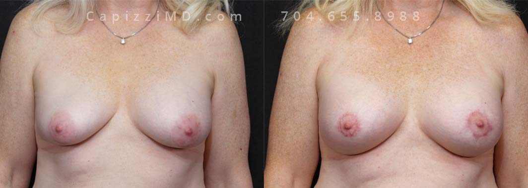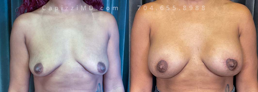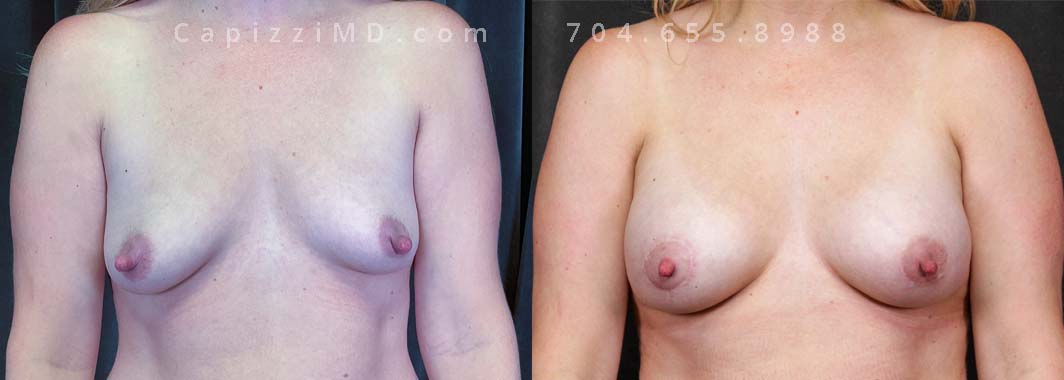 Natural enhancement was key for this patient. Implants boosted volume, while a mini lift lifted the nipples for a perkier look. (Sientra Smooth Round HP 330cc gummy bear implants).