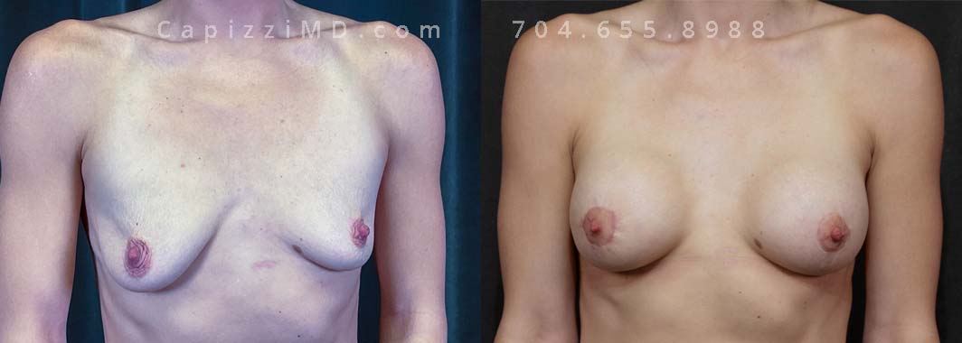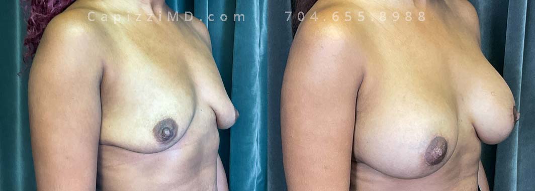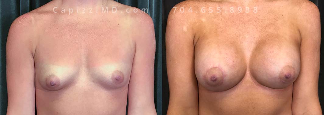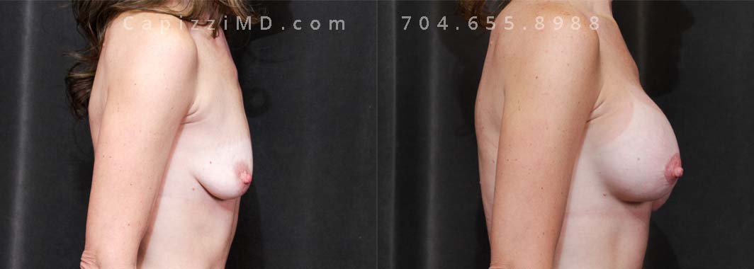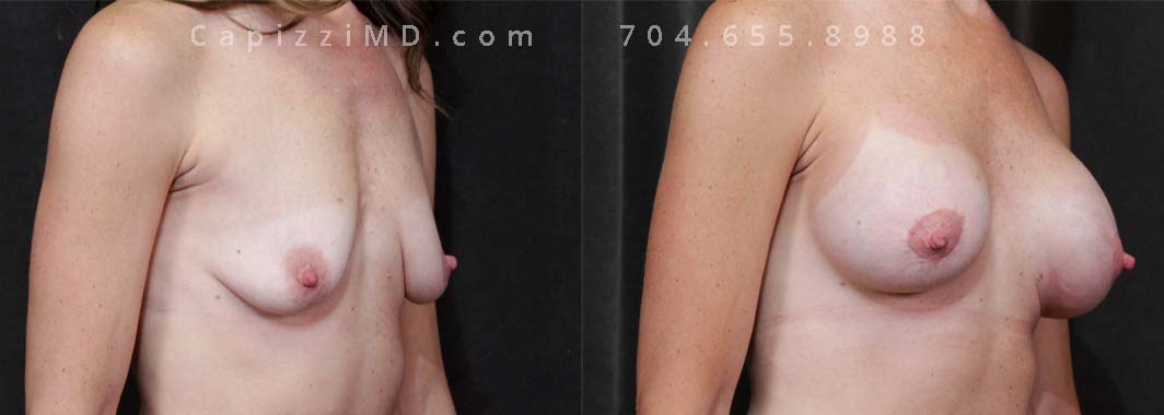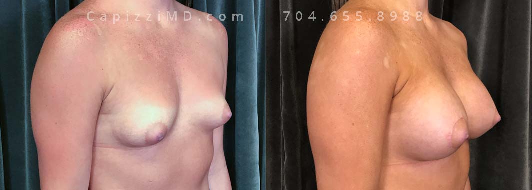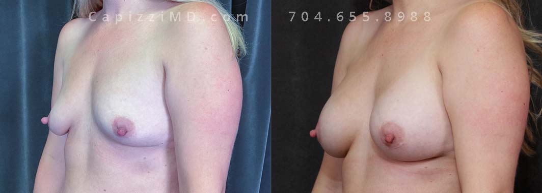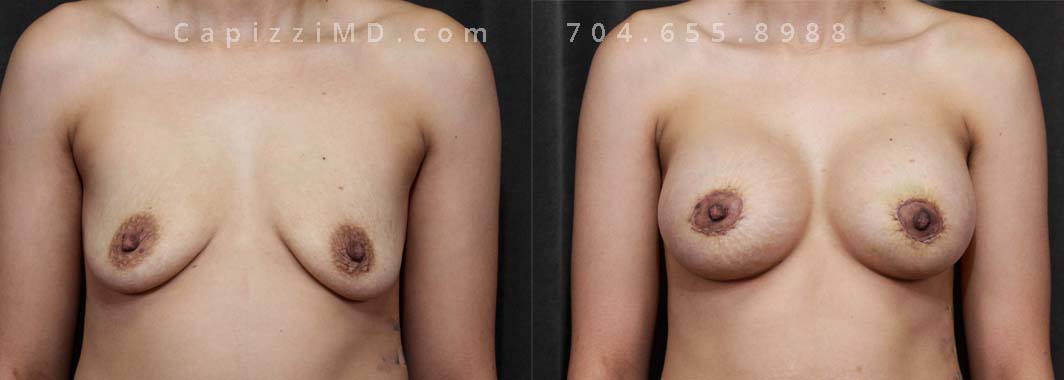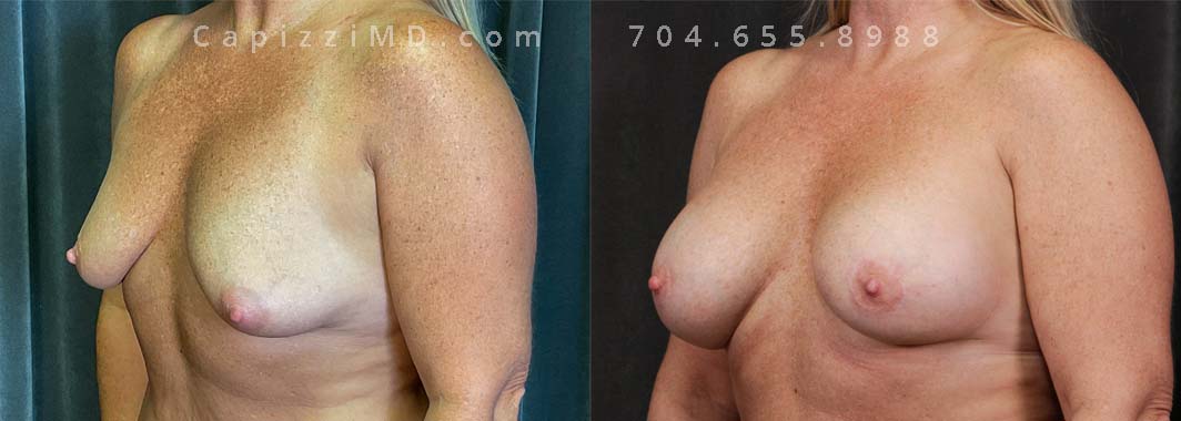 Natural enhancement was key for this patient. Implants boosted volume, while a mini lift lifted the nipples for a perkier look. (Sientra Smooth Round HP 330cc gummy bear implants).