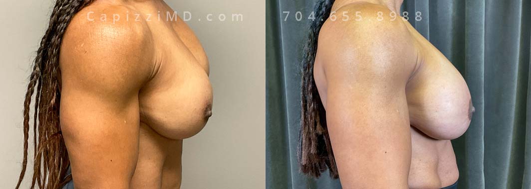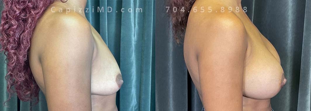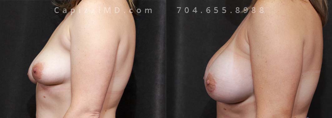 This patient wanted natural-appearing larger breasts. A breast augmentation achieved her volume desires while a mini breast lift realigned her nipples. Sientra Smooth Round HP 440cc implants.