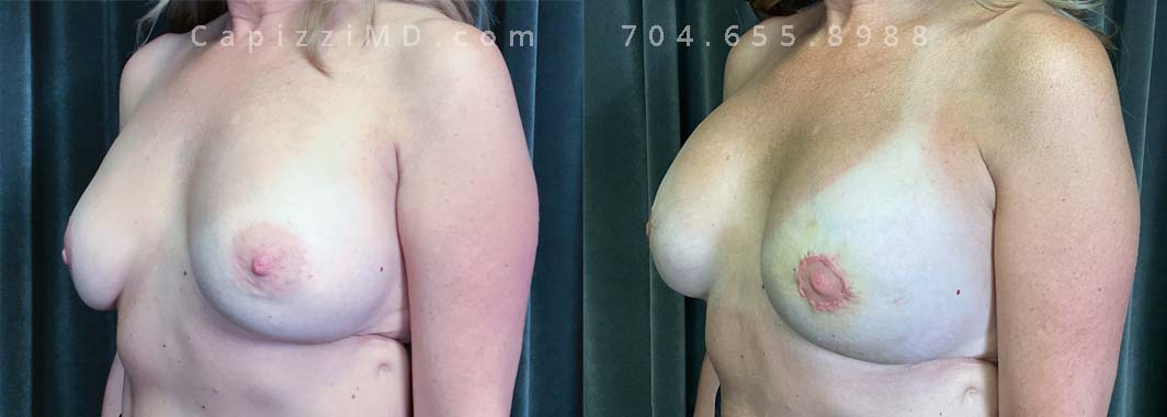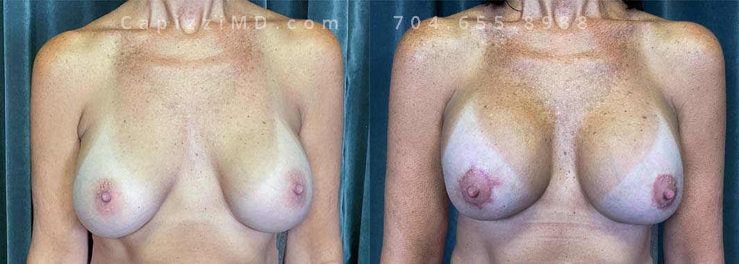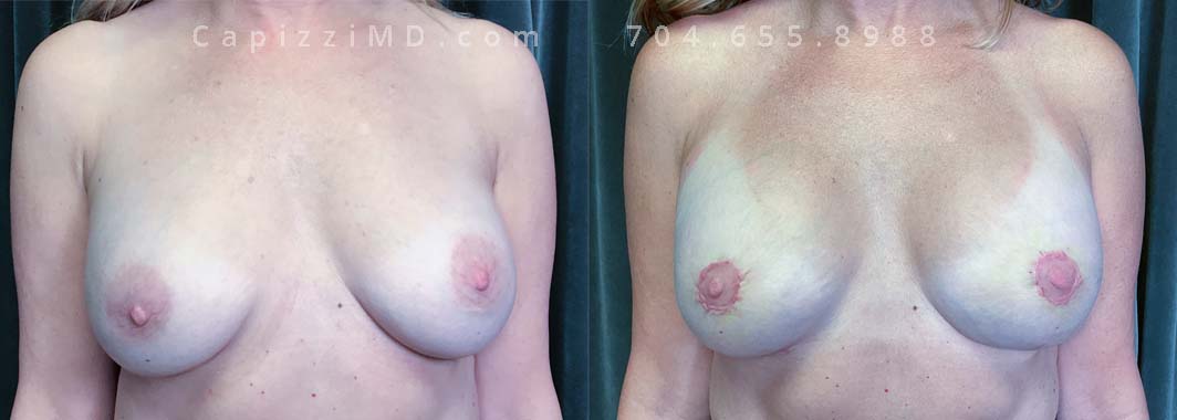 This patient wanted to add subtle volume and resize/reposition her areolas. A breast augmentation with Sientra Smooth Round HP 280cc implants and a mini lift helped her achieve her goals.