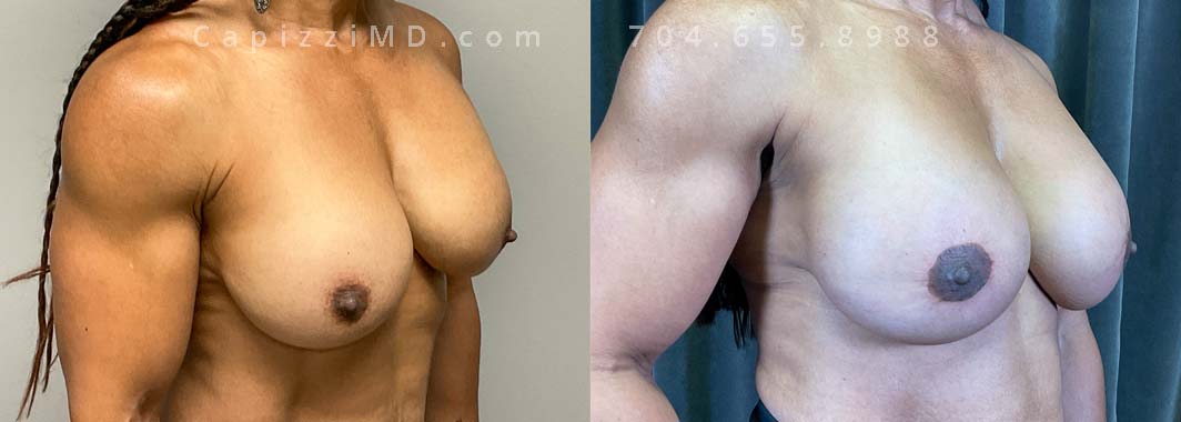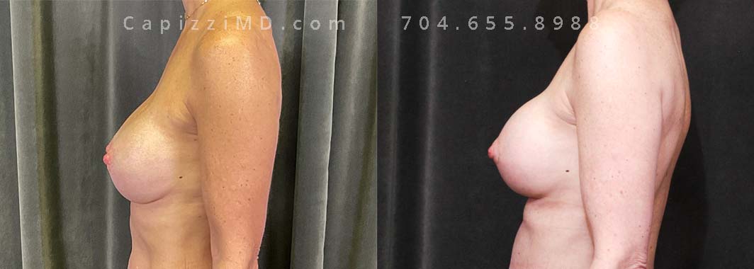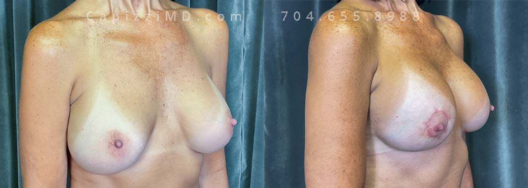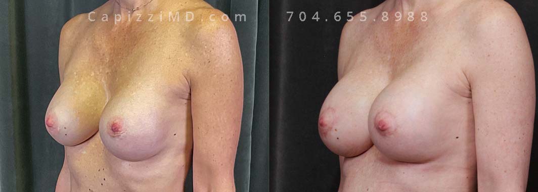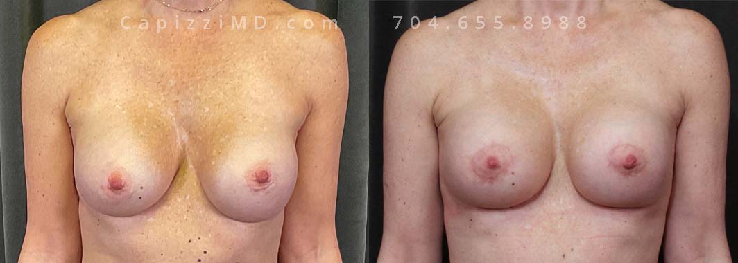 This patient wanted to fix displacement of her existing implants and restore her upper pole volume. She made the switch from saline implants to Sientra Smooth Round HP 415cc gummy bear implants with a mini lift and internal bra placement.