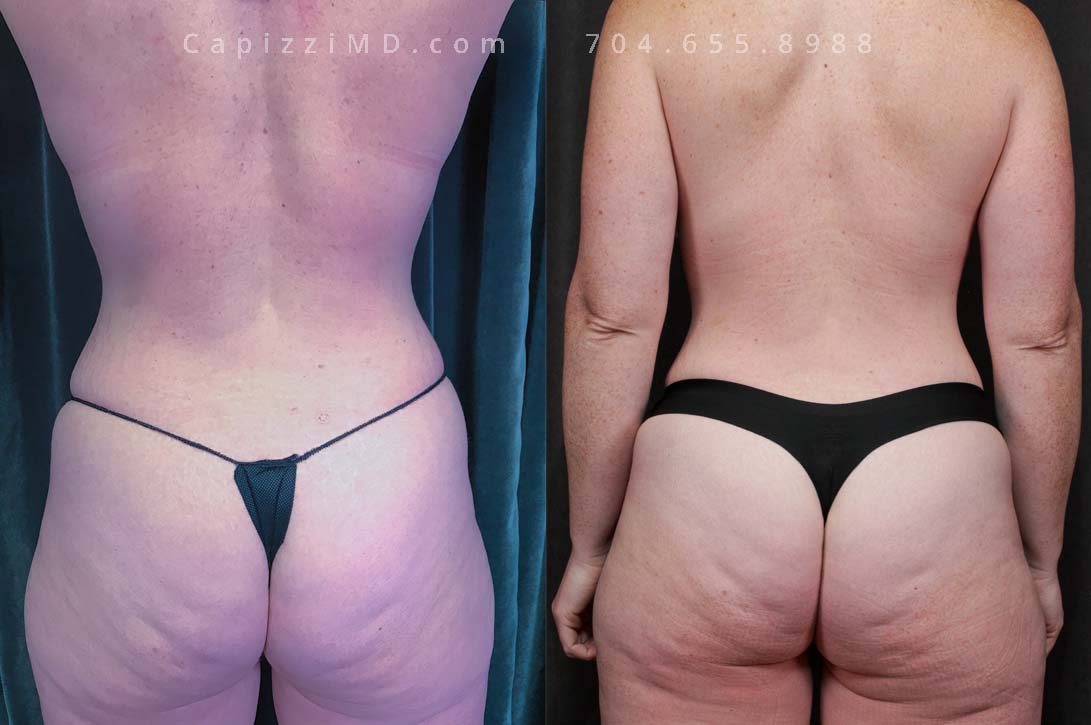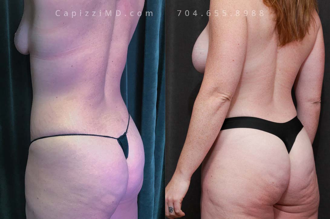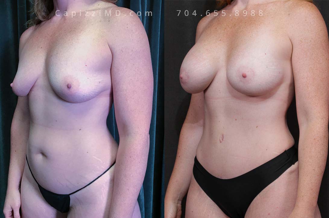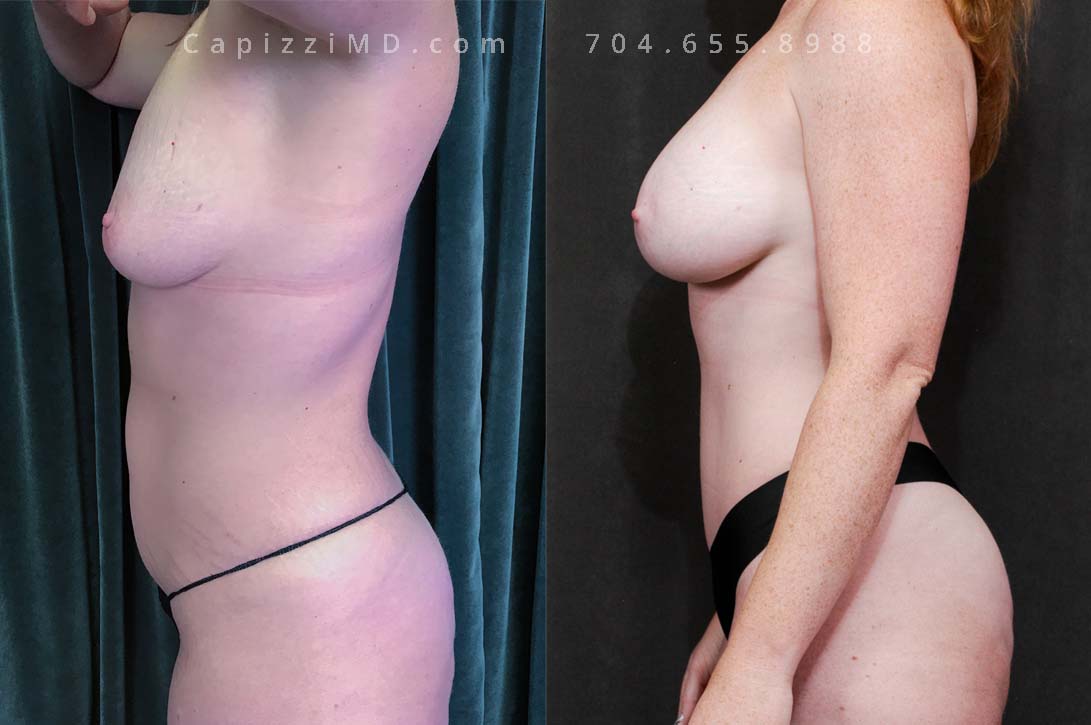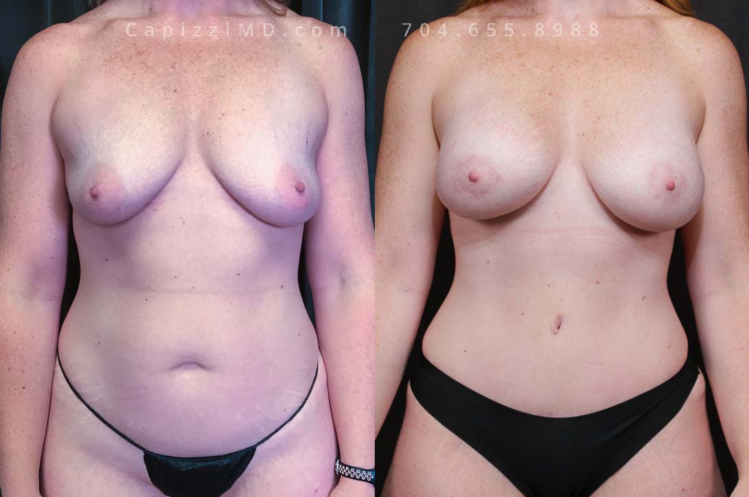 This patient wanted a mommy makeover after having children. Her goals were achieved with a Breast Augmentation, Mini Breast Lift, Tummy Tuck, and liposuction to her posterior hips. Sientra Textured Round HP 470cc implants.