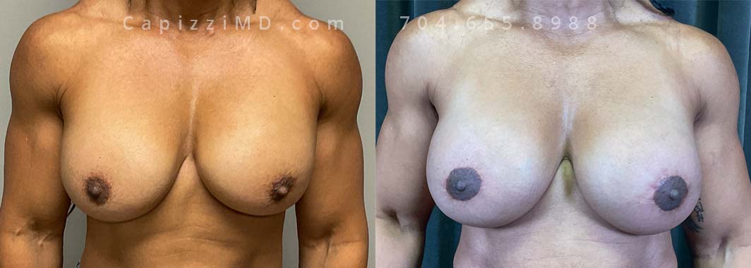 This patient desired a natural-looking fill and a boost for her breasts. So, she traded her saline implants for Sientra Smooth Round HP 385cc and 415cc gummy bear implants. She also received a mini lift and internal bra placement to help keep their placement.