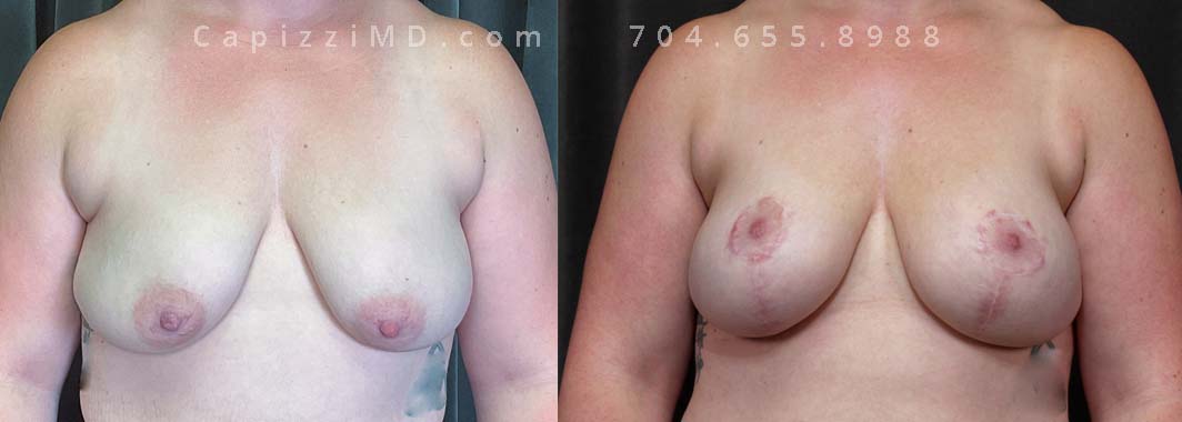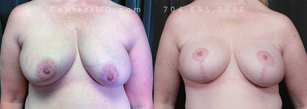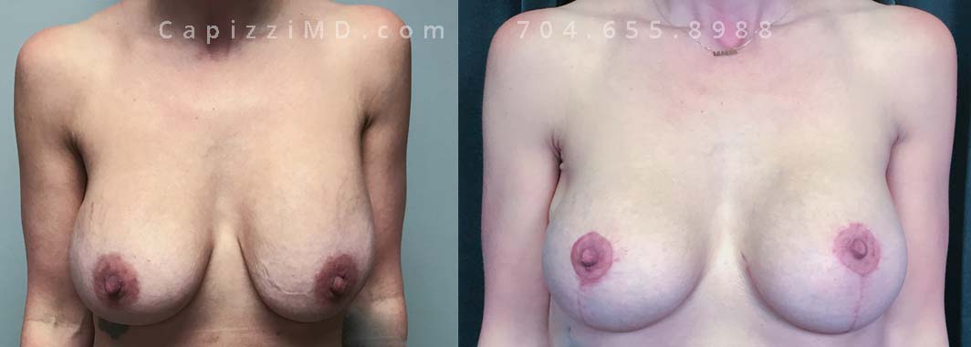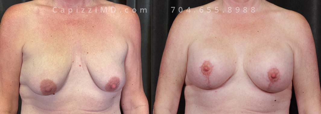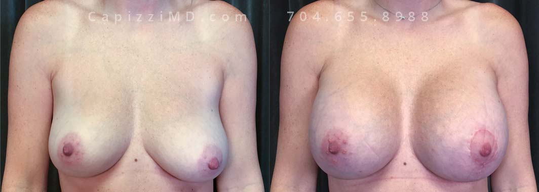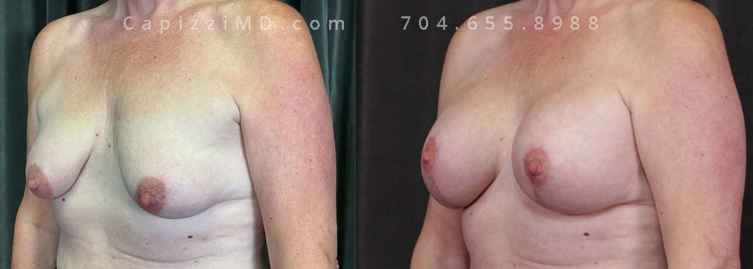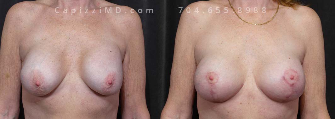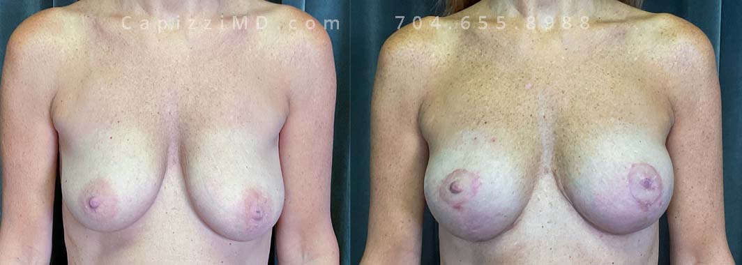 This patient had implants placed over 20 years ago and was seeking a change to something smaller. An implant exchange gave her the perfect size while repositioning her nipples perfectly.