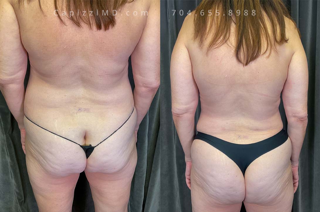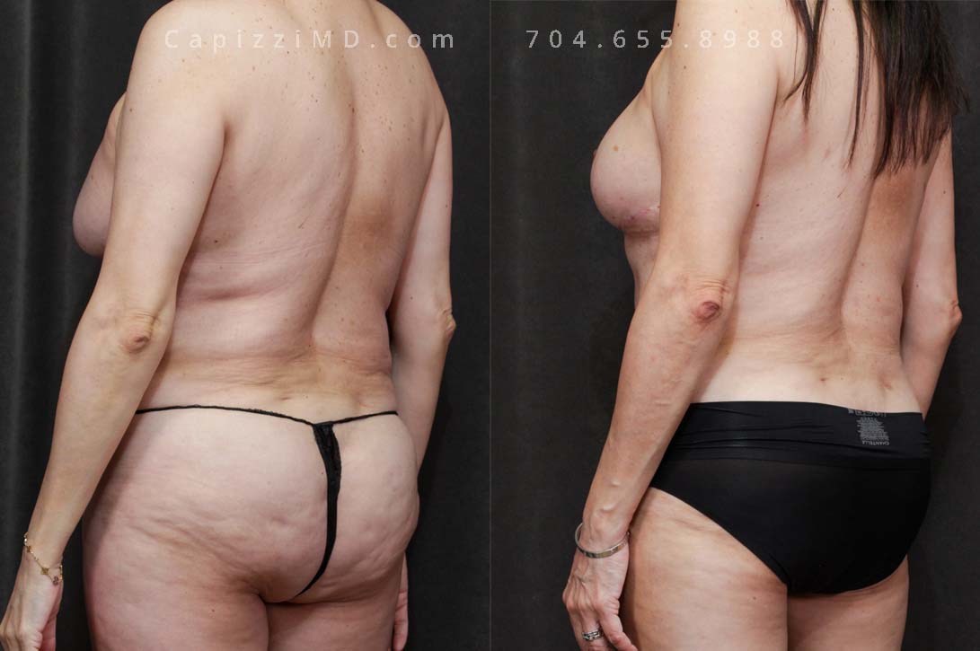 A breast augmentation with modified lift (R) and full lift (L) combined with liposuction was the treatment plan to enhance breast volume while also addressing asymmetry.