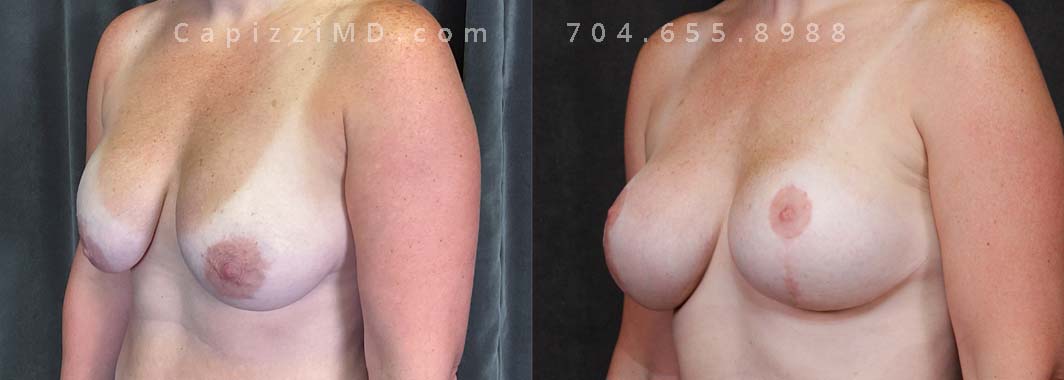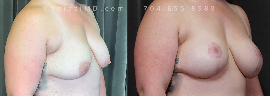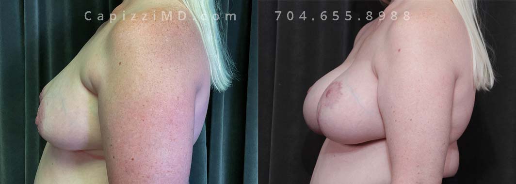 Seeking to augment breast volume and optimize nipple positioning, this patient underwent a modified lift with augmentation. This procedure effectively addressed ptosis and resulted in a desired increase in cup size.