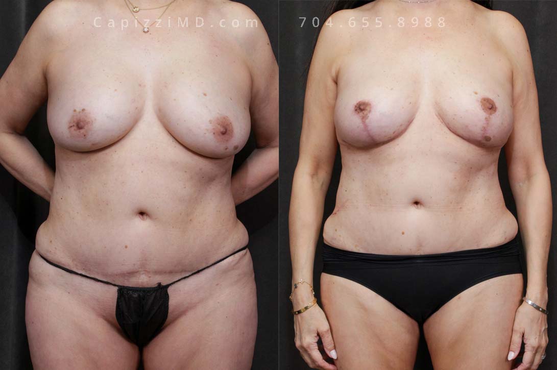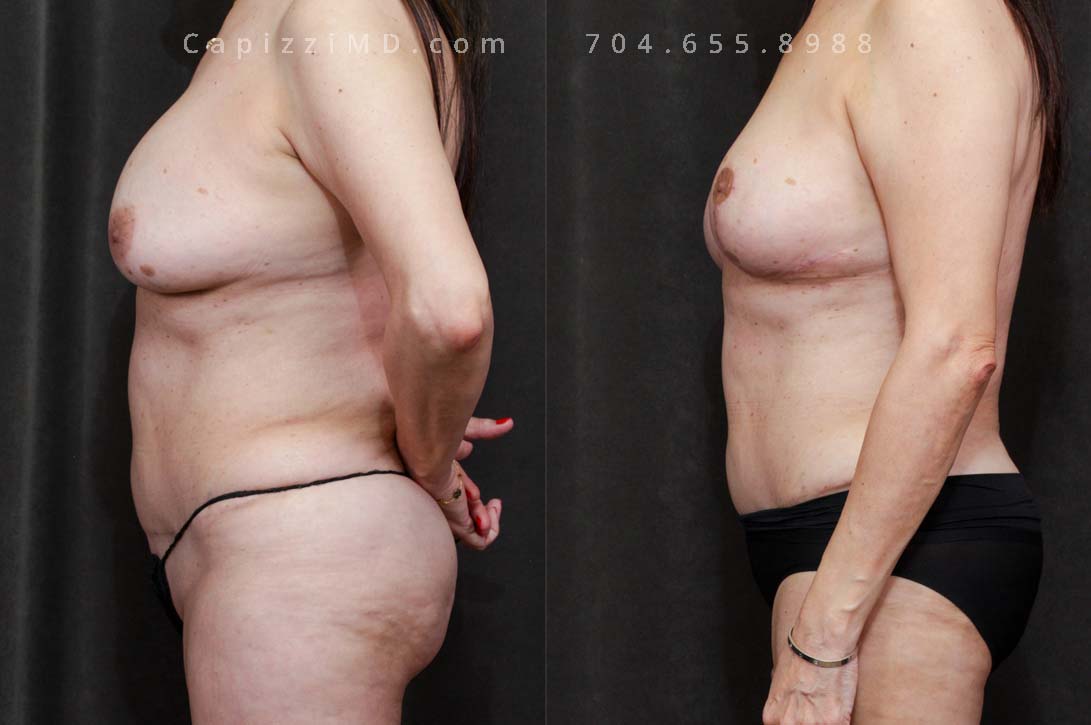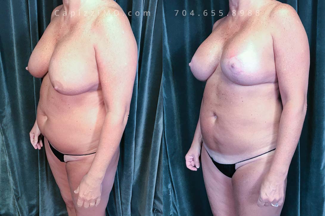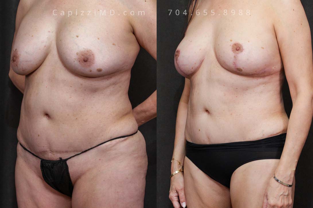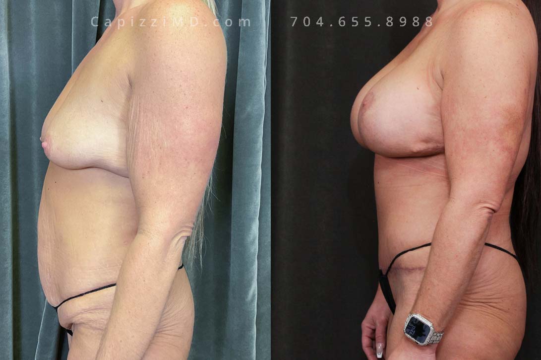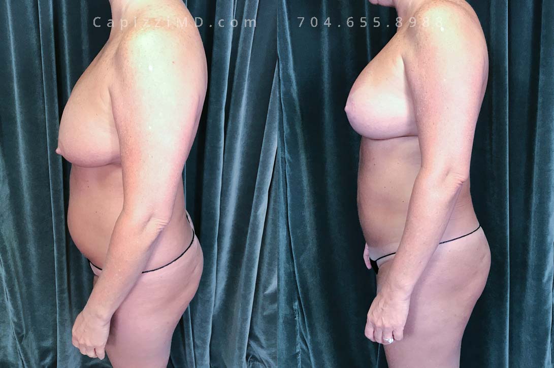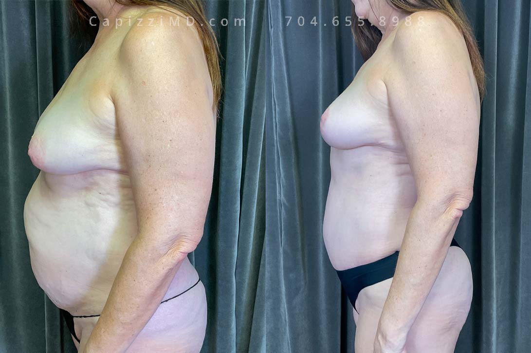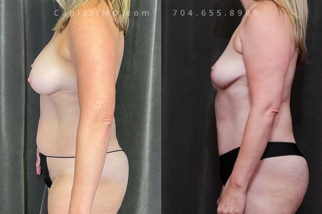 This woman desired her pre-baby body back. Her breast ptosis was solved with a modified lift, while a Mini Tummy Tuck and liposuction addressed her abdominal contours to give definition to her waist and hips.