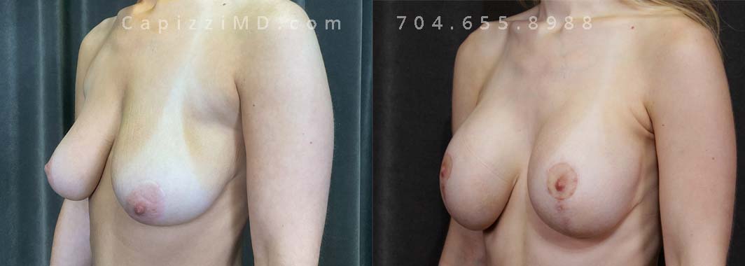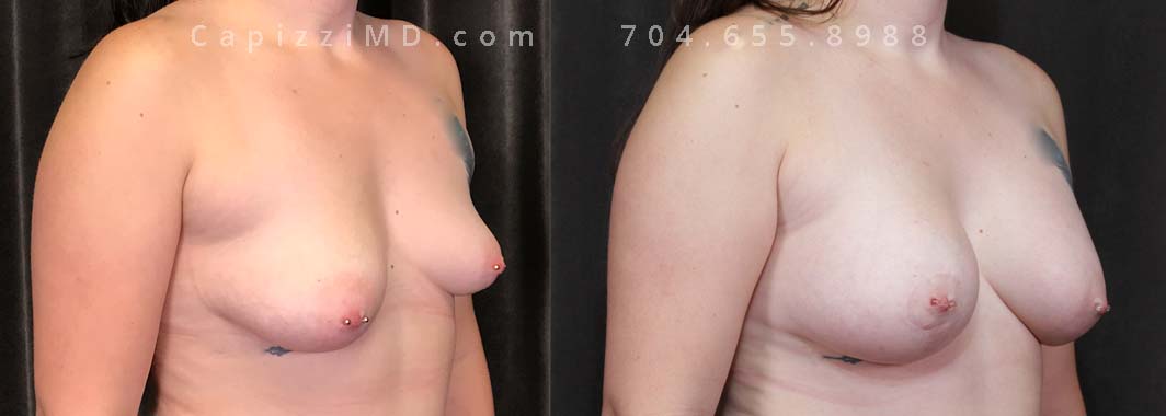 This young patient wanted to enhance her breast volume while re-aligning her nipples. A modified lift with breast augmentation helped to correct her ptosis (dropping) and give her an additional cup size.